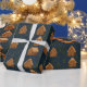 Wrapping paper with a cozy illustrated gingerbread village pattern on a deep blue background, featuring warm-toned houses, evergreen trees, and delicate snowy accents. The repeating design feels calm, nostalgic, and storybook-inspired.