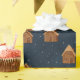 The hand-drawn pattern features charming gingerbread houses scattered over a deep blue background with soft snow-like details, creating a warm winter atmosphere without being overly seasonal.