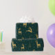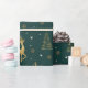 Des rennes dansants et dansants parmi des arbres de Noël stylisés dans une fausse feuille d'or sont parsemés de flocons de neige et d'étoiles dans cette élégante conception de papier d'emballage. Choisissez n'importe quelle couleur arrière - plan pour remplacer le vert profond que nous avons choisi comme exemple, ou laisser tel quel.
