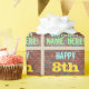 Cette conception amusante de papier d'emballage sur le thème de l'anniversaire comporte un message comme "HAPPY 8th BANTHDAY, NAME-HERE!", où le nom peut être personnalisé. L'arrière - plan est représenté par un mur en brique composé de briques de couleur rougeâtre. Le texte du message personnalisable comporte des couleurs comme le bleu, le jaune et le vert, et il a un aspect inspiré de celui des graffitis peints. Un papier comme celui-ci pourrait peut-être être utilisé pour envelopper les cadeaux d'anniversaire donnés à quelqu'un qui célèbre son huitième anniversaire. [~Z0000274]
