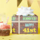 Cette conception amusante de papier d'emballage sur le thème de l'anniversaire comporte un message comme "HAPPY 41st BANTHDAY, JENNIFER!", où le nom peut être personnalisé. L'arrière - plan est représenté par un mur en brique composé de briques de couleur rougeâtre. Le texte du message personnalisable comporte des couleurs comme le bleu, le jaune et le vert, et il a un aspect inspiré de celui des graffitis peints. Un papier comme celui-ci pourrait peut-être être utilisé pour envelopper les cadeaux d'anniversaire donnés à quelqu'un qui célèbre son quarante et unième anniversaire. [~Z0000274]