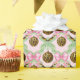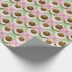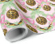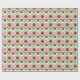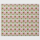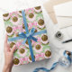This Christmas gift wrap has a pink bow Christmas swag trellis pattern with Christmas ornaments on a light pink background.