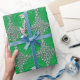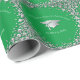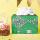 This modern design features a graduation hat and confetti in silver on a background of green with white text.