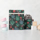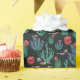 Hand painted cactus in green and blue gouache with red flowers arranged on dark background