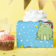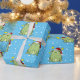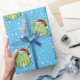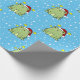 Jolie grenouille verte de Noël portant un chapeau de Père Noël rouge et blanc sur un arrière - plan bleu avec beaucoup de flocons de neige blancs.