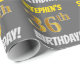 Ce design papier d’emballage comporte un message comme "36e anniversaire de STEPHEN!", avec le "36e" ayant une apparence de couleur fausse/imitation or, et avec le nom et "anniversaire" dans une police amusante et audacieuse. Le nom peut être personnalisé et l'arrière - plan est gris (gris). Un papier comme celui-ci pourrait peut-être être utilisé pour envelopper les cadeaux d'anniversaire donnés à quelqu'un pour célébrer leur trente-sixième anniversaire. [~Z0000211]