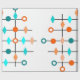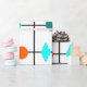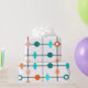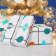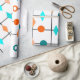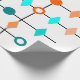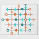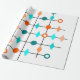 Ce papier d'emballage a une conception moderne du milieu du siècle d'une grille en lignes noires avec des cercles et des diamants orange et turquoises.