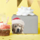 Arrière - plan de gris de papier d'enveloppe de cadeau de casquette de Père Noël de golden retriever.