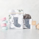 Papier d'emballage de Noël à l'allure scandinave imprimé dans des tons gris et vert turquoise avec rennes, bas, arbres de Noël et couronnes. Faites une pause dans l'enveloppement traditionnel de Noël rouge et vert et essayez ce design élégant et amusant.
