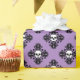 Papier d'emballage mignon en violet avec crânes blancs croisés sur un motif noir damassé. C'est génial pour envelopper ces prix de porte d'Halloween dans.
