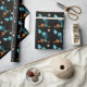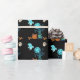 Envelopper le papier avec une illustration d'halloween cool déplaisant éffrayant. Un fantôme bleu glacé flotte dans l'air. Un vieil arbre mort a une chouette assise sur ses branches et une chauve-souris pendue à l'envers. Une main se lève d'une vieille tombe. Les chauves-souris volent autour d'une pleine lune brillante. Un peu de bonbons est rempli à la brim à l'intérieur d'un citrouille avec du maïs bonbon éparpillé à peu près. Un crâne flotte dans l'air. Placez-vous sur un arrière - plan noir.