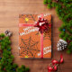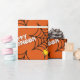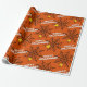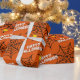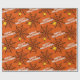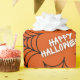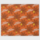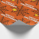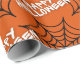 Ce papier d'emballage fantastique pour Halloween a des toiles d'araignée et des araignées sur un arrière - plan orange. White Happy Halloween texte.