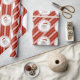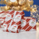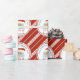 Répandez la joie de Noël avec ce papier d'emballage cadeau de vacances sur mesure et personnalisé avec un Père Noël très festif et guéri chantant HO HO HO. Décoré avec un classique de vacances de lignes diagonales rouges et blanches sur arrière - plan rouge, simulant des bandes de bonbons de menthe poivrée. Illustration originale de Suki's, tous droits réservés.