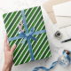 Gift wrapping paper is shown in a deep green and white stripes print.