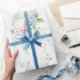 De magnifiques hydrangeas blancs mélangés à des fleurs bleues et à une verdure douce ont été utilisés pour créer ce beau papier d'emballage cadeau.