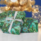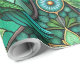 "Intricate green and teal stained glass-style pattern featuring hummingbirds and flowers on a rolled and flat surface. The design conveys a serene and elegant tone."