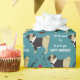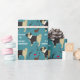 Un adorable carlin noir et bronzé porte une veste de smoking sur ce joli papier d'emballage d'anniversaire. À côté de lui, il y a des images d'une moustache, une paire de lunettes, une pipe et un coeur rouge. Le texte blanc dit "Tout habillé pour vous souhaiter un joyeux anniversaire". Les images et le texte sont placés sur un arrière - plan vert turquoise.