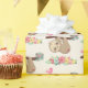 Papier d'emballage à motifs avec illustration d'un mignon paresseux brun accroché à l'envers. Ce drôle de petit gars se tient sur une branche qui a un petit oiseau rose d'un côté de la branche et un bouquet de roses à la façon d'un doodle de l'autre côté. En-dessous se trouve un arrangement de fleurs colorées dessinées à la main. Cette paresse adorable a aussi des joues roses et 3 coeurs mignons sur son cul.