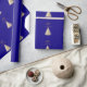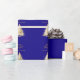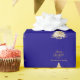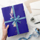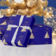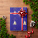 Un arrière - plan de couleur bleue. Décoré d'un arbre enneigé. Joyeux Noël est écrit avec un élégant script de style manuscrit. Personnalisez et ajoutez votre nom de famille. Texte doré.