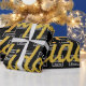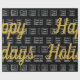Grand texte d'affichage indique 'Joyeuses Fêtes' en écriture dorée fausse. (Si vous le souhaitez, vous pouvez modifier le texte pour afficher un message personnalisé.) Remplacez le fichier logo d'affichage par le logo de votre entreprise. Votre logo apparaîtra dans un motif sur du papier d'emballage noir.