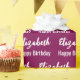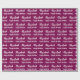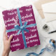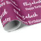 L'emballage d'anniversaire est du vin. Il a un motif texte pour le nom du destinataire dans un script et la phrase Joyeux anniversaire. Le nom (Montré : Elizabeth) apparaît dans un script élégant. Le texte est blanc. Tout le texte peut être modifié.