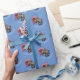 Papier d'emballage d'anniversaire avec un raton laveur gourmand au ventre plein, incliné contre les restes d'un gâteau d'anniversaire au chocolat avec glaçage rose qu'il a mangé. Pour les amateurs d'animaux gais mais mignons. Modifiez le texte par défaut ("HEUREUX ANNIVERSAIRE !") si cela est souhaitable, les modifications de texte seront répétées à travers la feuille.