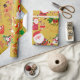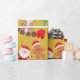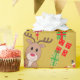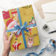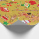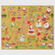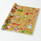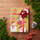 Ce papier d'emballage festif intitulé "Joyeux et Lumineux Noël" présente un design joyeux sur un fond doré. Orné d'illustrations charmantes en rouge, vert et blanc, il comprend des représentations adorables du Père Noël, de bonshommes en pain d'épice, de bonhommes de neige, de cannes de bonbon, etc., parfait pour répandre la joie des fêtes.