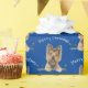 Terrier Yorkshire mignon sur la moule argentée et les lumières de fête sur un arrière - plan bleu avec Joyeux texte de Noël. La couleur Arrière - plan peut être modifiée.