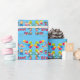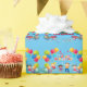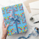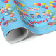 Un joyeux papier d'emballage d'anniversaire sur le thème bleu, des enfants fêtant avec des ballons, des casquettes de fête, des confettis, et un endroit pour le nom de l'enfant! Voir d'autres thèmes correspondants dans ma collection !