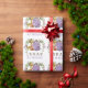 Parfait pour la fête d'anniversaire de Wild One de votre bébé, cet adorable papier d'emballage d'anniversaire animal safari dans la jungle est personnalisé pour ajouter le prénom de votre bébé. Cette enveloppe-cadeau d'anniversaire sauvage comporte un tigre, un singe, un éléphant et une girafe entourée de feuilles botaniques aux fleurs roses et violettes.