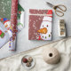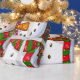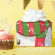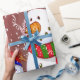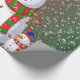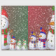 Cette image est celle d'une famille de bonhomme de neige, tous vêtus de leurs casquettes et foulards d'hiver colorés. Une carotte pour le nez et des boutons colorés pour les yeux et la bouche. Un fond vert et rouge avec des confettis de neige a été ajouté. Ce papier d'emballage est disponible en différents styles et formats.