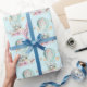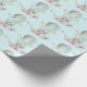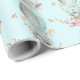 Papier enveloppant avec une charmante illustration d'un petit lapin chevauchant dans une montgolfière décorée d'un joli ruban rose, avec quelques fleurs et papillons. Un arrière - plan pastel bleu aquarelle lui donne une sensation de rêve vintage.