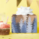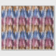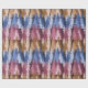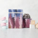 An illustration of layered pine trees arranged in horizontal bands, featuring cool pink, blue, and brown shades.