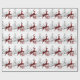 Bois d'hiver Enveloppement cadeau de Noël avec un renne rouge à l'aspect métallique sautant et le mot PEACE mis contre une forêt noire et blanche et enneigée avec pins et sapins recouverts de neige.