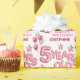 Le papier d'emballage anniversaire de enfant adorable comprend ballon rose numéro 5, ballon alphabet lettre, ballon étoile et ballon de fête. Avec un message de bienvenue "Joyeux anniversaire" et le nom de l'enfant. Les deux peuvent être customisés.
