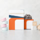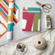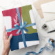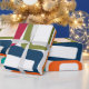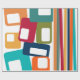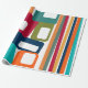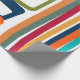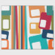Ce papier d'emballage a un design moderne du milieu du siècle de lignes et rectangles dans les tons rétro d'orange, or, canneberge, turquoise, vert, bleu, turquoise et vert.