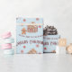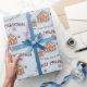 Ce papier d'emballage festif de Noël ou de vacances présente un thème de pain d'épices sain sur un arrière - plan doux et bleu bébé. Une image d'une maison en pain d'épices est photographiée au centre, avec un mignon petit homme en pain d'épices à gauche. Les petits biscuits rouges de flocon de neige neigent du ciel. Un exemple de voeux de Noël de Joyeux est imprimé au-dessus de l'arbre et un exemple de nom de famille est imprimé ci-dessous. Vous pouvez personnaliser l'emballage cadeau pour inclure votre propre nom ou texte personnalisé.