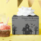 La silhouette de Destei d'une maison hantée avec trois chauves-souris, un arbre déplaisant et une clôture tordue. Il y a aussi deux zones de texte personnalisables. Les couleurs des éléments peuvent être changées, si vous le souhaitez.
