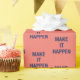 Dark blue "make it happen" text on pink background design.