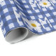 Mère texte avec fleur marguerite blanche et pétales sur blanc et bleu en vichy motif.