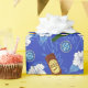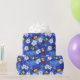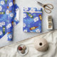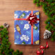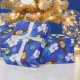 Papier cadeau bleu vif imprimé de bouteilles de bière sur fond de fleurs tropicales blanches et de palmiers. Le papier d'emballage idéal pour les enterrements de vie de garçon et les mariages sur la plage et autres célébrations qui impliquent de boire de la bière.