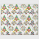 Ce papier d'emballage a un design moderne du milieu du siècle des arbres de Noël dans différents styles. L'une a une grille avec des rectangles avec des éclats à l'intérieur. Un autre comporte des rectangles arrondis avec des rectangles plus petits à l'intérieur. Un troisième a des lignes courbes avec des étoiles sur elles. L'arbre final est un triangle avec d'autres petits triangles à l'intérieur.