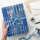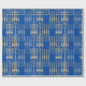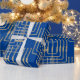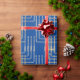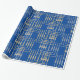 Un papier cadeau Hanoukka moderne argent, or et bleu avec un magnifique menorah carré argent et or brillant avec des bougies éclairées dans un motif géométrique.