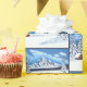 Papier d'emballage avec une scène hivernale magnifique, comprenant des montagnes enneigées, une cabane et des conifères. Le fond, les images et le texte peuvent être personnalisés. Œuvre originale de W.B.