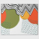 Ce papier d'emballage a un design moderne du milieu du siècle de lignes courbes et zigzag en noir, cercles en jaune, orange et vert, et un rectangle fait de lignes turquoises pointillées.