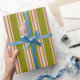 Ce papier d'emballage est décoré d'un motif rayé vert et rose. Il peut être amusant d'utiliser du papier d'emballage comme celui-ci lorsque des cadeaux sont offerts pour célébrer un anniversaire, un mariage, un anniversaire ou un autre événement.