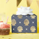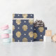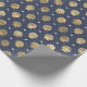 Papier d'emballage motif nautique bleu et or avec coquillages et perles dans un motif en treillis.