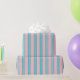 Ce papier d'emballage présente un motif rayé aux couleurs rose et turquoise foncé. Un papier comme celui-ci peut être utilisé pour préparer des cadeaux qui sont donnés pour célébrer un anniversaire, un mariage, un anniversaire ou un autre événement.