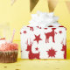 Papier à envelopper avec un motif illustré, silhouettes rouges avec rennes adultes et jeunes, avec étoiles dorées en arrière - plan, emballage parfait pour votre Noël