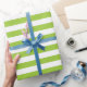 Ce papier d'emballage rayé de vert de chaux et blanc ajoutera le contact parfait à vos projets d'enveloppe et de métier de cadeau pour Noël et d'autres occasions de vacances.